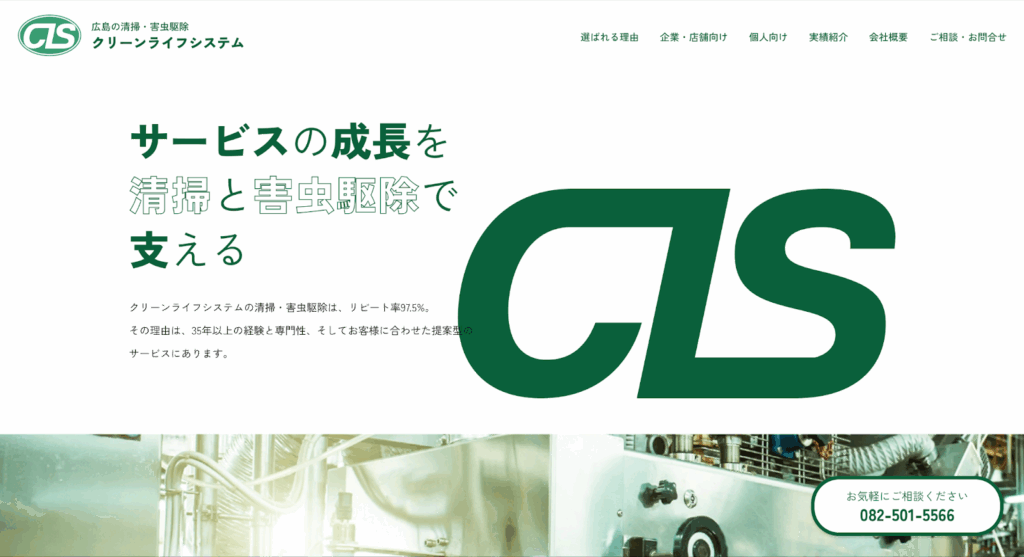 「リピート率97.5%」という高い顧客満足度が魅力の『㈲クリーンライフシステム』は、35年以上の経験を誇る衛生管理の専門業者です。広島県を中心に中国・四国地方の5県に対応しています。