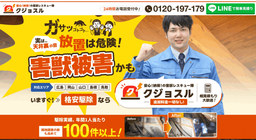 中国地方で高い専門性を持つ『株式会社クジョスル』は、1人あたり年間100件以上の豊富な対応実績を誇る害獣駆除業者です。中国地方の全域に対応しており、安心の最長10年の再発保証まで提供しています。
