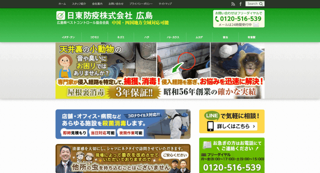 | 日東防疫 株式会社 | 広島県広島市東区福田2-350-1 | ※公開無し | https://www.hiroshima-nittoboueki.com/ |