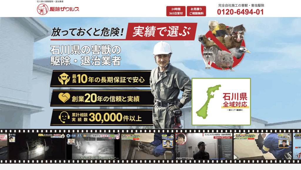 害獣駆除のプロ集団『駆除ザウルス』は、「創業20年の信頼と実績」があり、累計30,000件以上の相談実績を誇ります。ハクビシンやネズミ、シロアリなど幅広い害獣・害虫に対応しており、安心の「最長10年の長期再発保証」を提供しています。