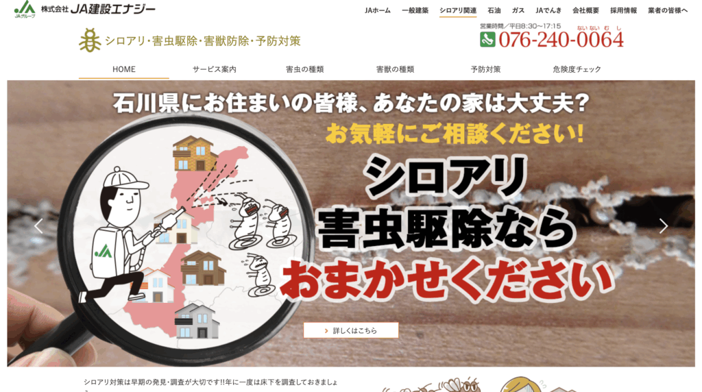 | 株式会社JA建設シナジー | 石川県金沢市古府1丁目217番地 | ※公開無し | https://www.jahome.jp/termite/ |