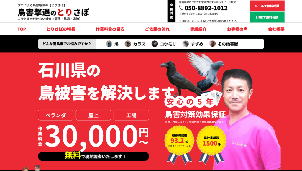 無料の現地調査を行い、鳥の習性を計算した効果的な駆除に加え、ご近所トラブルにまで配慮した提案を行います。施工後も最長「10年間」の鳥害対策効果保証が付き、電話、メール、LINEで問い合わせを受け付けています。
