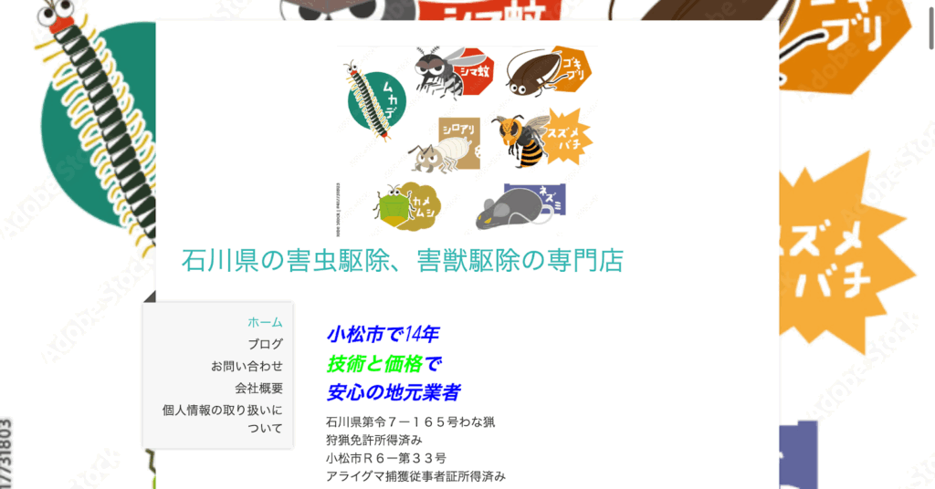 『害虫駆除、害獣駆除ハイジョ』は、小松市で14年の実績を持つ、技術と価格で選ばれる地域密着型の専門業者です。「狩猟免許」を所持しており、アライグマといった野生動物の駆除にも専門的に対応します。