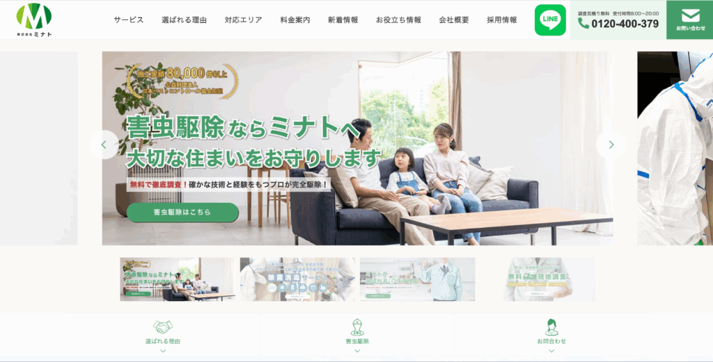 大手不動産やチェーン店との取引実績が豊富な『株式会社ミナト』は、日本ペストコントロール協会にも加盟する害獣駆除の専門業者です。他社で解決できなかった現場にも対応する高い技術力が特徴で、経験豊富なプロが綿密な現地調査のうえで最適な施工を行います。