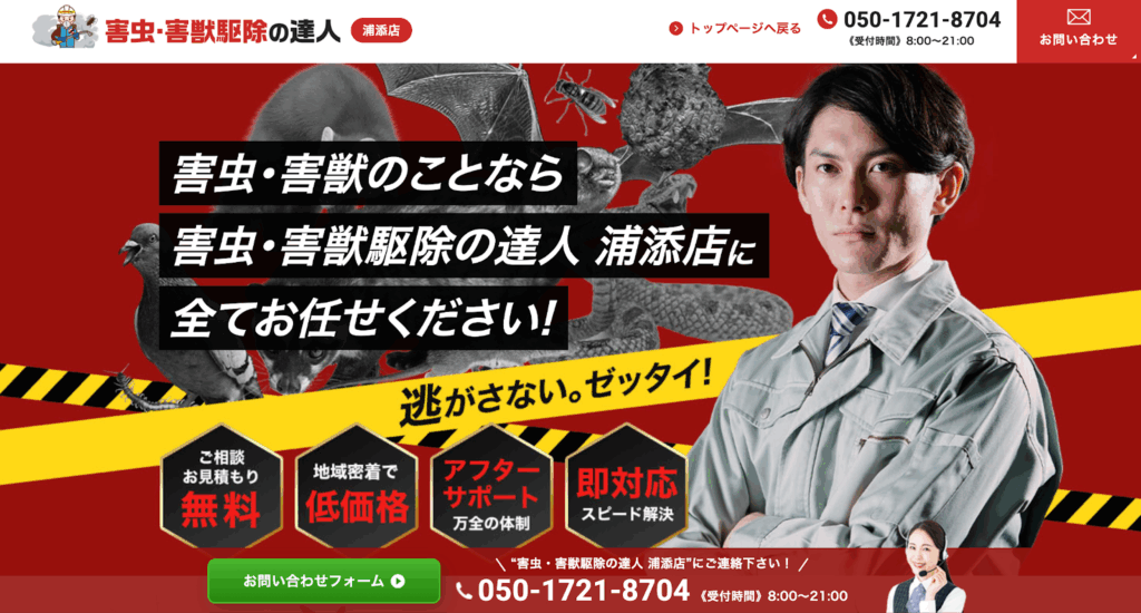 | 害虫・害獣駆除の達人 (合同会社PIKARIN) | 沖縄県浦添市伊祖5-8-12 | ※公開無し | https://kujo-tatsujin.com/shop/%e6%b5%a6%e6%b7%bb%e5%ba%97/ |