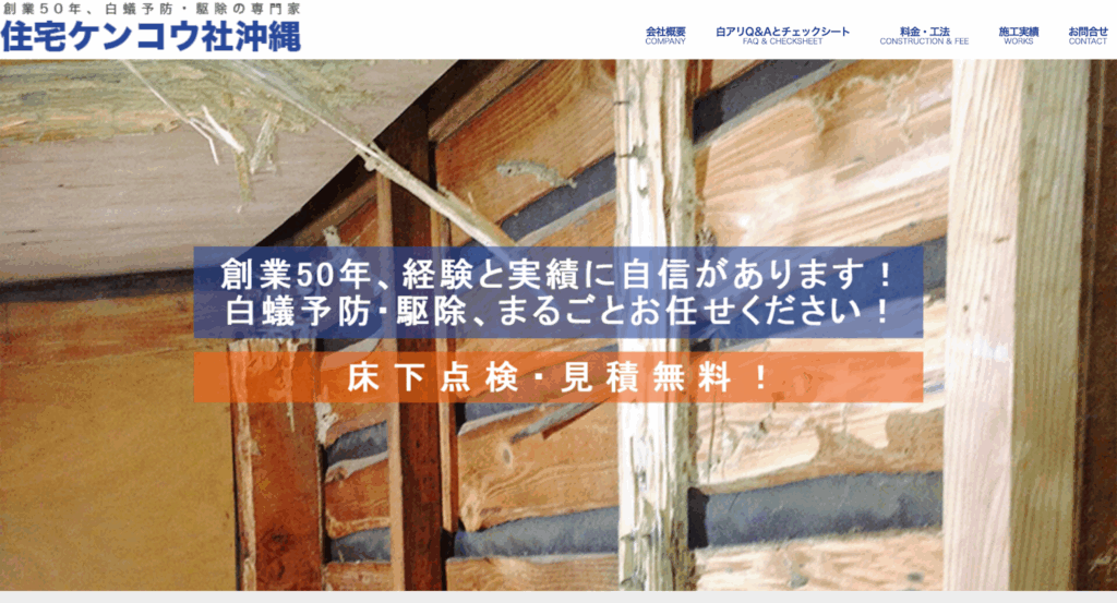 『住宅ケンコウ社沖縄』は、創業50年以上を誇る白蟻予防・駆除の専門業者です。施工実績は5,000棟を超え、守礼の門などの公共工事も手掛ける高い技術力が魅力です。