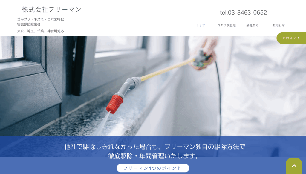 『フリーマン』は東京都内を中心に、害虫・害獣駆除から防除施工、環境衛生管理まで幅広く対応しています。中でも、害獣の再侵入を防ぐための施工技術には定評があります。施工後のアフターフォローも整っており、作業後の状態確認やメンテナンス提案が充実しています。