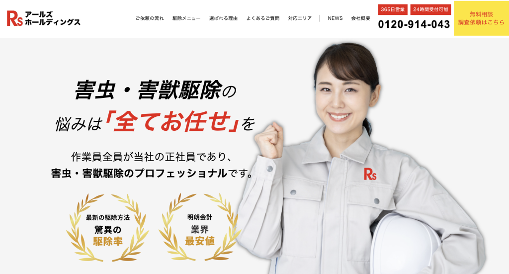 『アールズホールディングス』は、東京都内外で幅広く駆除事業を展開する企業グループです。各エリアに特化した駆除チームを持ち、地域特性を踏まえた駆除計画が強みです。東京都内では、住宅密集地やオフィスビルでの作業実績が豊富で、信頼性が高いと評価されています。