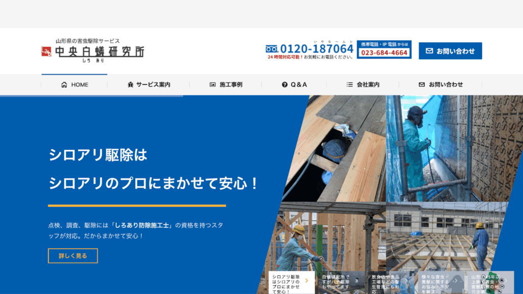 『中央白蟻研究所』は、「しろあり防除施工士」の資格を持つ専門家が直接施工する業者です。シロアリ駆除のノウハウを活かしたハチ駆除にも対応し、山形県全域から宮城・福島の一部まで駆けつけます。