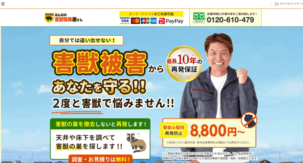 365日24時間受け付けており、YouTube動画撮影に協力すると駆除費用が大幅に割引されるキャンペーンも実施中です。