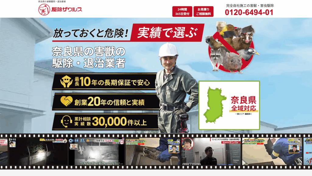 害獣駆除のプロ集団『駆除ザウルス』は、「創業20年の信頼と実績」があり、累計30,000件以上の相談実績を誇ります。ハクビシンやネズミ、シロアリなど幅広い害獣・害虫に対応しており、安心の「最長10年の長期再発保証」を提供しています。