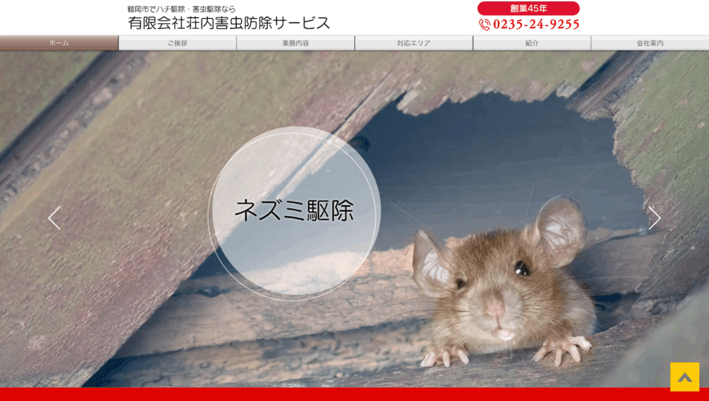 | 有限会社荘内害虫防除サービス | 山形県鶴岡市稲生1丁目14-18 | ネズミ駆除円~、ハクビシン駆除円~ | https://www.syonaipcs.com/ |