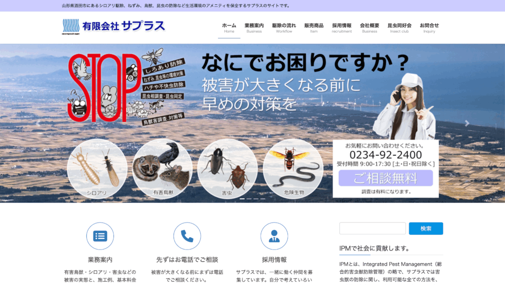シロアリ駆除を専門とする『有限会社サプラス』は、1994年創業、多数の実績を誇ります。(公社)日本しろあり対策協会の会員であり、防除施工士など法令の厳しい条件をクリアしたプロが施工を担当します。