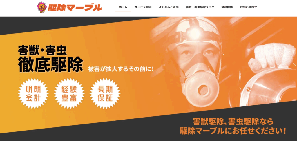 『駆除マーブル』は、創業25年で2,000件以上の実績を持つ害獣駆除業者です。ハクビシン、ネズミ、シラミなど幅広い害獣・害虫駆除に対応しています。