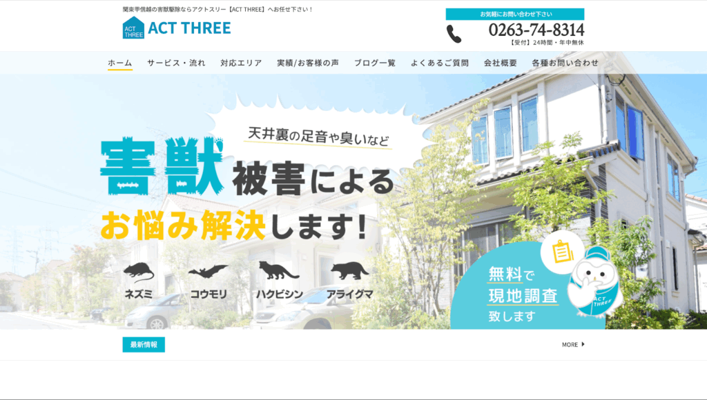 『ACT THREE』は、関東、甲信越エリアを中心に、ネズミ、コウモリ、ハクビシンなど、害獣の駆除に特化したサービスを提供しています。