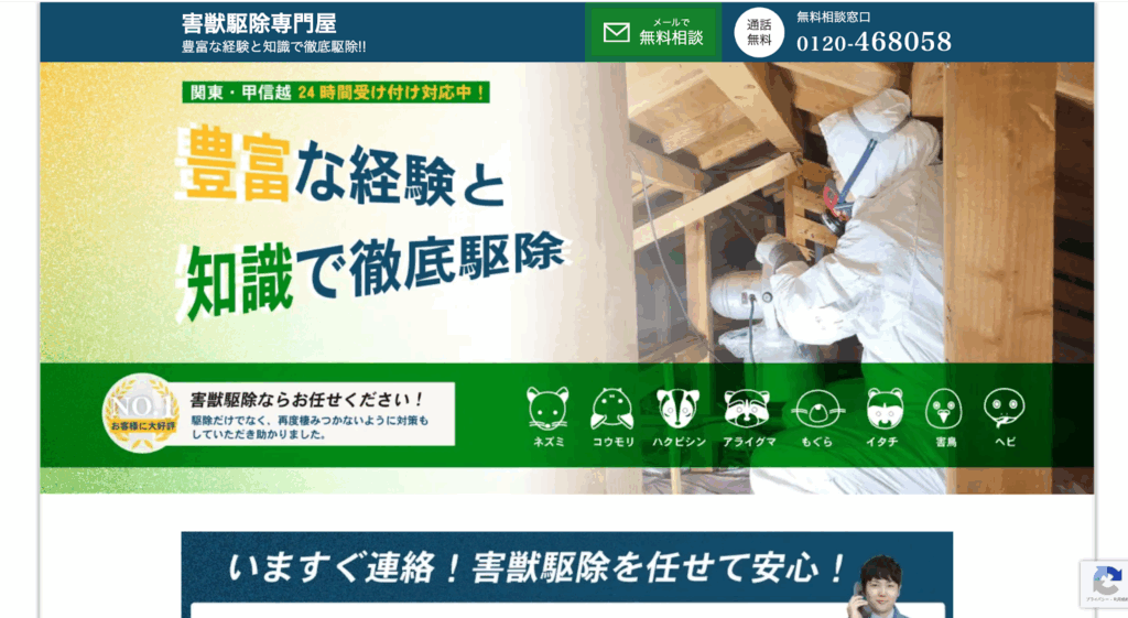 最長10年の再発保証があり、駆除後の消毒作業まで対応しています。経験豊富な駆除スタッフが丁寧に対応し、大手下請けの上位企業として信頼も得ています。長野市内であれば現地調査は無料で、期間限定の割引キャンペーンも実施することもあります。365日営業しているので、いつでも相談が可能です。