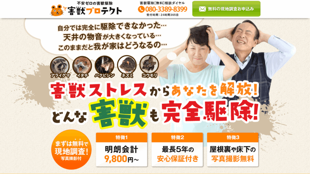『害獣プロテクト』は全国規模で害虫獣駆除の施工を行います。最低価格9,800円〜と明朗会計・安心価格でサービス提供をしています。ネズミ、ハクビシン、コウモリなど、あらゆる害獣に対応しています。